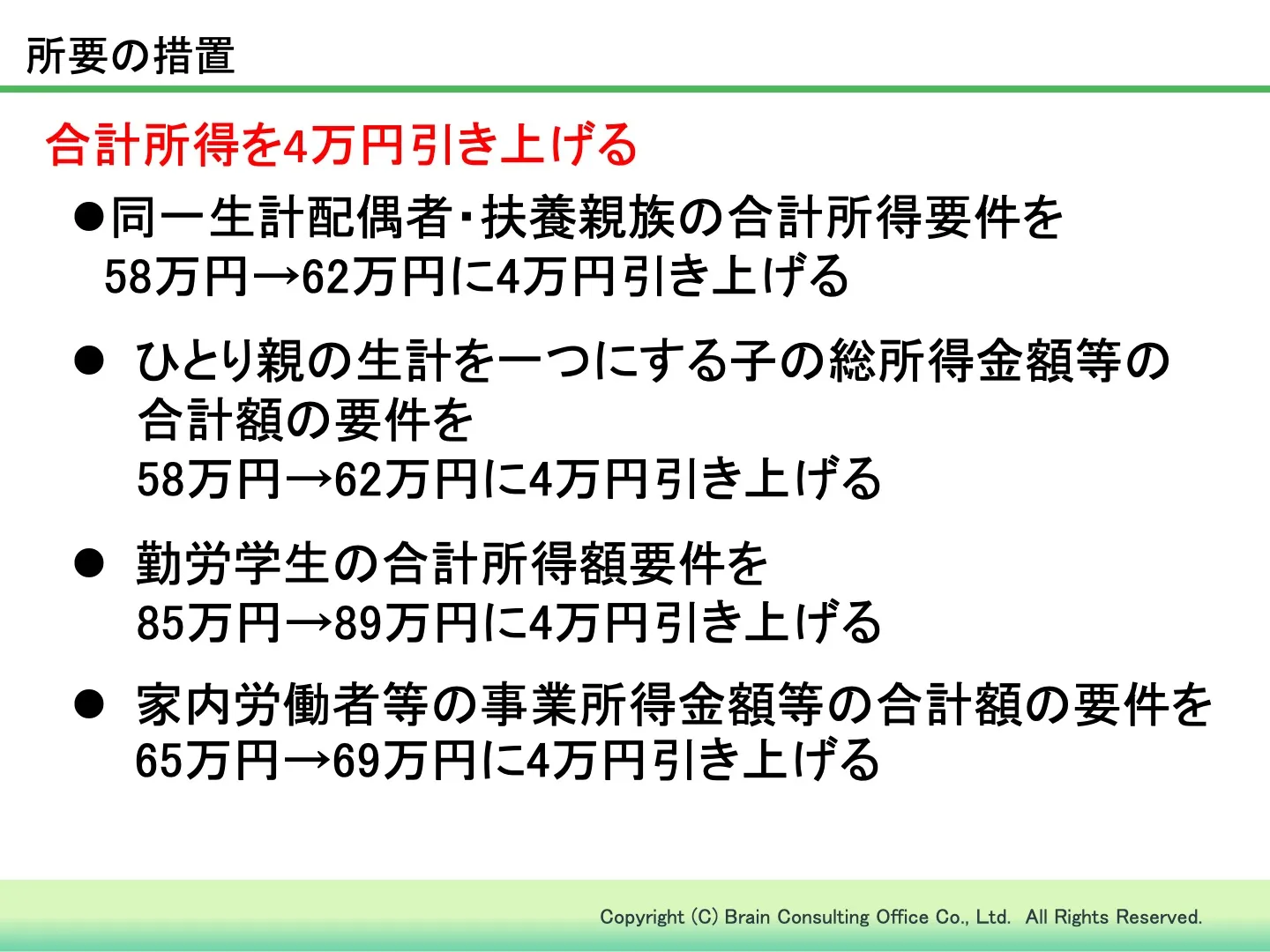 - 扶養親族等の所得要件: 基礎控除等の引き上げに伴い、同一生計配偶者や扶養親族の合計所得金額要件などが一律4万円引き上げられます。